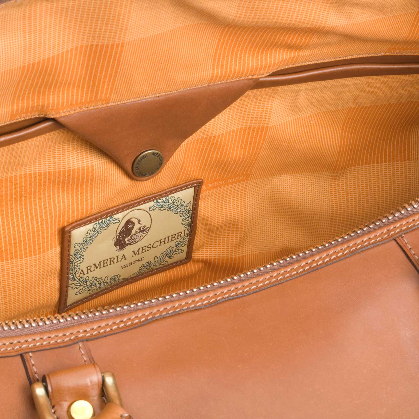 La fodera è in un bellissimo colore arancio con disegno in Principe di Galles. Il marchio “Armeria Meschieri” è inserito nel disegno del tessuto.